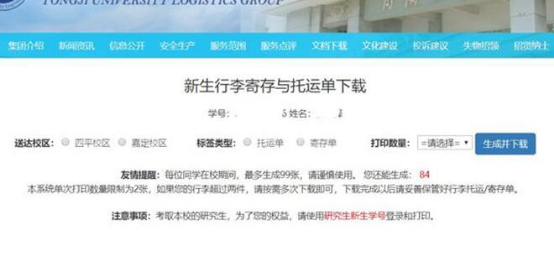(3)在校期间,每位学生最多可自助打印99张“行李标签”。反复点击“生成并下载”将浪费学生个人的可使用资源,请勿随意使用。